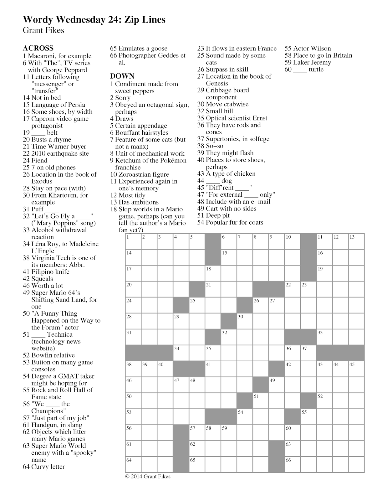 A Cleverly-Titled Lo | A Cleverly-Titled Lo posted @ 2014-11-19 7:46 PM Link to original post : Wordy Wednesday #26: Not Divided Into WordsWORDY WEDNESDAY #24 ZIP LINES (answer) It's been two weeks, so time to unveil the answer to this puzzle. If you still wish to solve it yourself, please go here. Here's a list of people who solved it:Adam Weaver ** Bo Green ** Bryce Herdt ** Carl Worth ** Cheryl Chan ** Christian H.P. ** Giovanni Pagano ** Izak Bulten ** Jack Bross ** Jack Lance ** James McGowan ** Jeremy Conner ** Joel Martin ** John Bulten ** Marc Enyedy ** Mark Tilford ** Randy Rogers ** Ryan Faley ** Sam Levitin ** Tim Harrod ** And the contest winner, who will receive a copy of the two Wordplay issues in which I've been published, is. . . INSERT NAME HERE! But wait, that's not all! I promised a third prize drawing for those individuals who've solved Wordy Wednesday #23 and #24, and the winner of that drawing is. . . INSERT NAME HERE!!! Congratulations! random.org likes you!! WORDY WEDNESDAY #25 PENT WORDS 5 (hint) 12 people have solved last week's puzzle. Haven't solved it yet? Here's an easier version. Send your solutions to glmathgrant[at]gmail[dot]com within the next week to appear on the solvers list and be recognized for your puzzle prowess. Good luck, solvers!WORDY WEDNESDAY #25.5 PENT WORDS 5.5 (bonus!) The mark of a good puzzle writer is when other people write puzzles in your original styles, and I am happy to say that I am not the only Pent Words author in existence. Fan Ryan Faley recently sent me a Pent Words of his own, and despite the potential obscurity of some of the references, I was really honored by his creation, and found it amusing enough to share here. I hope Ryan continues to enjoy my creations, as well! :)WORDY WEDNESDAY #26 NOT DIVIDED INTO WORDS __ __ __ __ __ __ __ __ __ __ __ __ __ __ __ __ __ __ __ __ __ __ __ __ __ __ __ __01 02 03 04 05 06 07 08 09 10 11 12 13 14 15 16 17 18 19 20 21 22 23 24 25 26 27 28 __ __ __ __ __ __ __ __ __ __ __ __ __ __ __ __ __ __ __ __ __ __ __ __ __ __ __ __ 29 30 31 32 33 34 35 36 37 38 39 40 41 42 43 44 45 46 47 48 49 50 51 52 53 54 55 56 __ __ __ __ __ __ __ __ __ __ __ __ __ __ __ __ __ __ __ __ __ __ __ __ __ __ __ __ 57 58 59 60 61 62 63 64 65 66 67 68 69 70 71 72 73 74 75 76 77 78 79 80 81 82 83 84 __ __ __ __ __ __ __ __ __ __ __ __ __ __ __ ___ ___ ___ ___ ___ ___ ___ ___ ___ 85 86 87 88 89 90 91 92 93 94 95 96 97 98 99 100 101 102 103 104 105 106 107 108 Causing harm or grief: 71 22 39 102 84 52 30 Tie with rope: 37 72 53 47 Sweatshirt that also covers your head: 60 45 09 42 107 20 One of four on a Monopoly board: 103 05 26 44 18 85 78 54 Give off bubbles and hiss: 38 106 15 64 10 98 58 19 34 80 It might be an acorn hoarder: 66 21 17 97 76 86 32 04 Trinket or bauble: 93 101 08 96 41 70 Game show “The ____ Link”: 63 99 75 57 90 88 48 Creature which sometimes elicits an "Eek!": 91 51 46 12 03 Noted role for Adam West: 65 43 59 100 104 24 Residents of Riyadh: 62 27 31 79 67 50 Child actress Hayley: 89 92 28 55 06 Hedburg who said, “Every book is a children's book if the kid can read!”: 87 61 95 108 02 Emulated an owl: 94 13 49 01 77 11 Decade of the inauguration of Ike: 105 56 14 25 82 69 33 Band with the album "Dreamboat Annie": 74 23 35 81 68 ____ the dots: 29 16 36 83 40 73 07 Posted in contests, Wordy Wednesday |