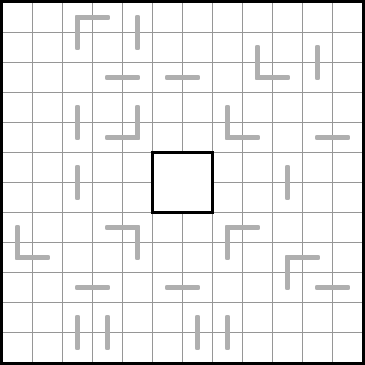 EnigmAttic | EnigmAttic posted @ 2015-03-17 11:00 PM Link to original post : Grille de la semaine #127Règles : Noircissez certaines cases, de sorte que toutes les cases noires soient reliées orthogonalement et ne forment jamais un carré de 2x2 cases. Un chiffre indique le nombre de cases noires adjacentes parmi les huit cases voisines de la case chiffrée. Si plus d'un chiffre est présent, les blocs de cases noires doivent être séparés par au moins une case blanche. Une case chiffrée ne peut pas être noircie. °°°°°°°°°°°°°°°°°°°° Blacken some cells, so that all the black cells are linked orthogonally and never form a 2x2 square. A digit in a cell tells how many black cells there are amongst the eight neighbors of this cell. If there is more than one digit, the black cell blocks must be separated by at least one white cell. A cell containing a digit can not be blackened. #140 TapaPosted in Puzzles, Tapa |